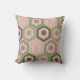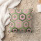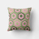 This throw pillow has a geometric design of hexagons in four shades of green on a field of pink stripes in two shades.