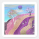 This gorgeous abstract landscape depicts a rolling hillside scene with blooming spring trees and birds in shades of pink, purple, beige, tan, gold, green, and blue.