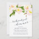 Elegant and modern floral rehearsal dinner invitation features a bouquet of ethereal pastel watercolor flowers in shades of rich cream and blush pink, with lush green botanical accents. Personalise with your rehearsal dinner details in elegant midnight blue lettering accented with handwritten style calligraphy. Cards reverse to solid jasper green.