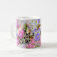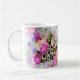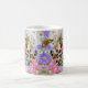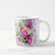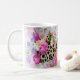 A bouquet of pretty spring flowers, with pink tulips, anemones, and other flowers with a pretty butterfly.