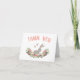 A cute thank you note card perfect for spring and Easter, featuring the phrase "thank you" in coral brush lettered font and a delightful illustration of a rabbit sat in the middle of a floral bouquet/bough, and flying bees.
