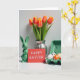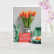 This greeting card shows a spring tabletop scene set against a bright white background, arranged with a calm, close-together feel like friends leaning in for a photo. On the left sits a glossy green ceramic bunny with upright ears and a relaxed face 🐰. Just beside it, a red card stands upright with a short Easter message centred in small white letters, drawing your eye like a quiet note passed between loved ones. Behind them, a bouquet of tulips rises from a fluted silver vase, with petals shifting from orange to soft yellow and green stems filling the space with fresh colour 🌷. On the right, a pale green carton holds decorated eggs, mixing black dots, orange spots, and simple stripes that look carefully chosen rather than rushed. Soft, diffuse light smooths the surfaces and adds gentle highlights to the ceramic, the vase, and the egg shells, keeping the arrangement tender and inviting. The eggs sit snugly in the carton, each pattern clearly visible against the pastel green edges.