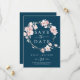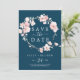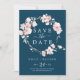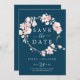 This spring cherry blossom navy save the date card is perfect for a modern wedding. The oriental floral design features a whimsical blush pink watercolor cherry blossom tree branch and green leaves with an elegant Japanese style.