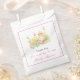 Pretty baby shower favour bag with an adorable chick and pink and yellow tulips. Perfect for a spring or summer baby shower. The words can be changed to suit your own details or requirements