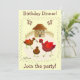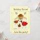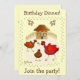 Illustration of 3 chickens playfully tossing a worm in their yard. Behind is their cute hen house with a fence. A track of chicken foot=prints surrounds the image, and a cluster of brown eggs decorate the card. Customise your message on front and inside. Inside: another chicken and a track of foot prints add charm to your invitation.