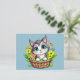 Springtime and Easter design with a cute grey and white cat in a basket with flowers.