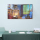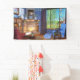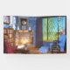 A cosy reading corner on a sunny spring day. Warm sunlight streams in through the lattice windows, leaving shadows on the wall and lighting up the cherry blossom "snowglobe" on the bookshelf. In the window is a colourful suncatcher sparkling in the light. Around the hearth are cushy armchairs, with vases of flowers and books and a steaming teacup, but the windows are open to let in the spring breeze. Outside a spring-green willow and beech hedge and red Japanese maple are surrounded by tulips and cornflowers, while a ginger cat stalks through the long grass.