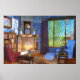 A cosy reading corner on a sunny spring day. Warm sunlight streams in through the lattice windows, leaving shadows on the wall and lighting up the cherry blossom "snowglobe" on the bookshelf. In the window is a colourful suncatcher sparkling in the light. Around the hearth are cushy armchairs, with vases of flowers and books and a steaming teacup, but the windows are open to let in the spring breeze. Outside a spring-green willow and beech hedge and red Japanese maple are surrounded by tulips and cornflowers, while a ginger cat stalks through the long grass.
