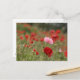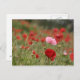Spring field with red poppies and one pink poppy in the middle of green grass.