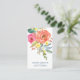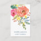 Unique and elegant business card design features a bouquet of watercolor flowers in blush pink and peach with soft green leaves, with your name and title or business name displayed along the bottom .