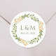 Custom-designed classic round wedding favour stickers/labels featuring couple/ bride and groom's initials/monogram and wedding date encircled in a watercolor floral wreath.