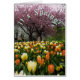 A lovely Spring greeting card, showing a variety of orange and yellow tulips on lower part, and fully blossoming pink and white cherry trees on top. It's Spring in the park!