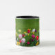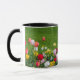 Spring flower border filled with tulips and narcissi with a lush green lawn.