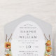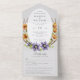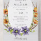 All in one tri- fold wedding invitation featuring an oval watercolor spring flower arrangement and garland with tulips, clematis and forsythia, foliage and twigs. Wedding invitation, rsvp card and envelope combination.