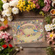 Illustrated sun hat with flowers and two blue birds on custom colour background; editable text inside the ribbon for your event.