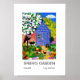 A poster of a handpainted paper collage by Judy Adamson of a Spring Garden with a blue shed, blossom tree, bird table, watering can, boots, blackbird and a cat asleep on a white bench. All sizes available including greeting cards.