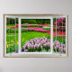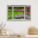The artwork creates the illusion of having a window that is encased by a a white bay frame. The illusion makes you feel as though you're looking out at a beautiful lush spring garden.