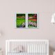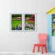 The artwork creates the illusion of having a window that is encased by a a white frame. The illusion makes you feel as though you're looking out at a beautiful lush spring garden.