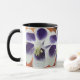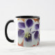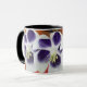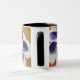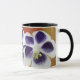 White and purple flowers, yellow, orange,red background. Abstract art collage design on mug.