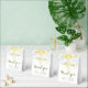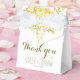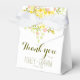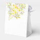 Lovely wedding favour box in a cheerful yellow and green colour scheme on a crisp white background. Original illustration of floral blooms and greenery adorn the top front and back of the box. Personalise with your text, the bride and groom names and wedding date. Perfect for an outdoor, spring, summer, evening, or garden wedding.