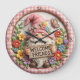This charming round wall clock features a whimsical 3D-style digital illustration of a cheerful garden gnome. The gnome, sporting a long white beard and a tall pink hat adorned with a checkered bow and colorful blossoms, holds a rustic wooden sign that reads "WELCOME FRIENDS." The scene is nestled within a lush frame of sculpted flowers in vibrant shades of pink, yellow, blue, and purple, accompanied by a delicate butterfly. The background consists of light-colored wood planks, while the outer rim of the clock features a stylish pink and white gingham check pattern with elegant numeric markers. This functional home decor piece is a perfect addition to entryways, kitchens, or sunrooms, serving as a warm greeting for guests. It makes a delightful housewarming gift or seasonal accent for anyone who loves folklore and garden-themed art.