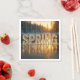 The word "SPRING" is crafted in ice, placed on a frozen surface reflecting the warm glow of a sunset.