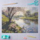 Decoupage tissue paper featuring a pink flowering tree next to a river. A lovely springtime inspired landscape in a large size for furniture decoupage craft projects.