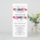 Elegant watercolor botanical wedding ceremony program with your names and details with a frame of watercolor green leaves and bright flowers in pink and blue and purple.