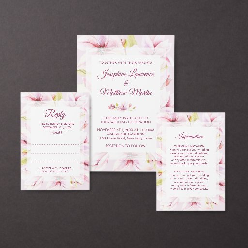 These wedding programs feature beautiful magnolia flowers. The front of the card has the ceremony and the back of the card lists the bridal party. These wedding programs are part of a collection which includes a range of matching wedding stationery such as wedding invitations, reply cards, enclosure cards, address labels, stickers and much more. Please visit the collection pages in our store to see the full range.