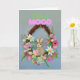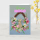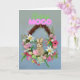 Spring Mood. Cute Easter holiday card with an illustration of a Easter Bunny surrounded by flowers, berries, and greens in a wreath egg shape. Art, image, and verse copyright © Shoaff Ballanger Studios, 2026.