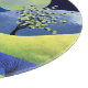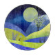 An abstract landscape depicting rolling hills with a blooming spring tree and plants and a moon and stars in shades of blue, cyan, yellow and pink.