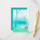 Wedding Reception Enclosure Card with Morning spring forest with trees with leaves and shrubs against the background of the sunrise and light blue sky. Light sunlit airy blue turquoise country landscape with trees and lush green grass. Juicy gentle softness spring nature