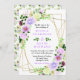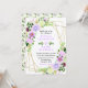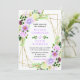 This fun and whimsical wedding invitation features watercolor purple flowers and foliage on a gold geometric frame. The text combines handwritten script and serif fonts for a stylish and modern look. This is perfect for a spring or summer rustic wedding.