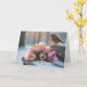 A robin perches on a snowy bench beside a bouquet of pink tulips, with a gentle sunrise in the background for thinking of you.