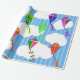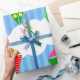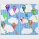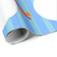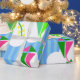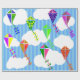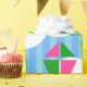This wrapping paper has a geometric design of kites flying in the clouds of a blue striped sky. It is very colourful and festive.