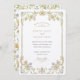 This wedding invitation features a delicate gold frame adorned with watercolor wildflowers and soft botanical curves. The floral artwork includes blush pinks, cornflower blues, buttery yellows, and leafy greens, all illustrated with vintage charm and a light hand-painted touch. The frame design has an open, airy feel, offering a fresh and elegant presentation for romantic weddings.