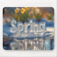 The word Spring appears in ice, melting gently in a sunlit scene with blooming daffodil flowers in the background