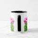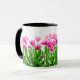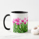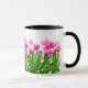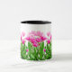 Original fine art design of colourful pink tulips by artist Carolyn McFann of Two Purring Cats Studio printed on a customisable coffee mug for spring flower fans .