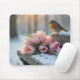 A robin perches on a snowy bench beside a bouquet of pink tulips, with a gentle sunrise in the background
