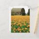 Spring tulips bloom in front of old barn. postcard