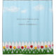 This charming design features a white picket fence and a row of red, pink, and yellow tulips. Use the space in the blue sky to write a name or inspirational words.
