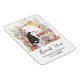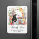 Custom wedding thank you magnet favours for your guests, featuring a bride and groom gnomes and a colourful spring floral arch illustration. Edit the template with a date and the newlyweds' names.