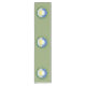 This altar cloth, or table runner, features the wheel of the year in the pale greens of Spring, spelling out the eight Wiccan Sabbats. In between each holiday is a graceful curling leaf. In the centre of the wheel, is a wreath with a half sun/half moon image representing the vernal equinox. Perfect for your Spring rituals. Ostara, Beltain, Litha, Lughnasah, Mabon, Samhain, Yule, and Imbolc are all represented here. Customise the background to any colour you desire.
