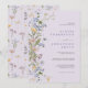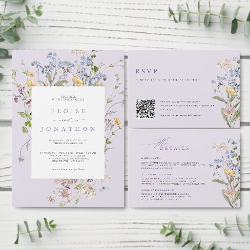 This elegant lavender wedding invitation features a vertical cascade of delicate wildflowers in soft pastel tones. The botanical artwork blends muted purple hues, airy meadow blooms, and subtle foliage accents for a romantic yet minimalist look. The clean layout paired with whimsical florals creates a chic and timeless design perfect for modern couples.