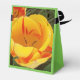 The vibrant beauty of this yellow tulip shows the season has moved from cold, dark winter to the lighter, warmer days of spring. With vivid yellow petals streaked with scarlet against the background of deep green leaves and foliage, this is a striking spring tulips floral design.