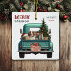 A teal blue retro pickup truck carries a decorated Holiday tree and gift packages on this cute glass Christmas ornament. Looking out from the tailgate is a beautiful brown and white Springer Spaniel dog. A rustic wooden sign on the back bumper says "Christmas Cheer". The red and green stylised text at the top left says "MERRY CHRISTMAS", with your name (or your dog's) and the year at the right. Both sides have the same image.