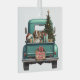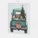 A teal blue retro pickup truck carries a decorated Holiday tree and gift packages on this cute glass Christmas ornament.  Looking out from the tailgate is a beautiful Springer Spaniel dog. A rustic wooden sign on the back bumper says "Christmas Cheer".