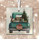 A teal blue retro pickup truck carries a decorated Holiday tree and gift packages on this cute glass Christmas ornament. Looking out from the tailgate is a beautiful Springer Spaniel dog. A rustic wooden sign on the back bumper says "Christmas Cheer".
