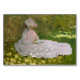 Springtime by Claude Monet, oil on canvas 1872, is a landscape painting of a young woman in billowing white dress and white bonnet seated in the shade beneath a group of trees, reading a book. Around her the intense light of the warm spring sun breaks through the leaves of the trees, dappling the bright green grass and her dress with intense flecks of sunlight. Monet painted the image in quickly applied, loose brush strokes of oil colours, capturing a pastoral moment of repose of the woman amid nature. The range of values from light to dark and harmonies of green, brown, grey and white tones capture the light, colour and atmosphere of a scene painted from life.