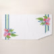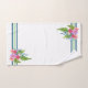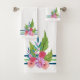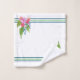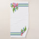 Springtime floral features a light, elegant floral design. This bath towel set has a trio of ruled borders, navy blue, lime green and navy blue, on the top and bottom of each item. In the lower right hand and upper left hand corners there are flowers and leaves with a soft, watercolor look. A welcome addition to brighten up any bathroom.